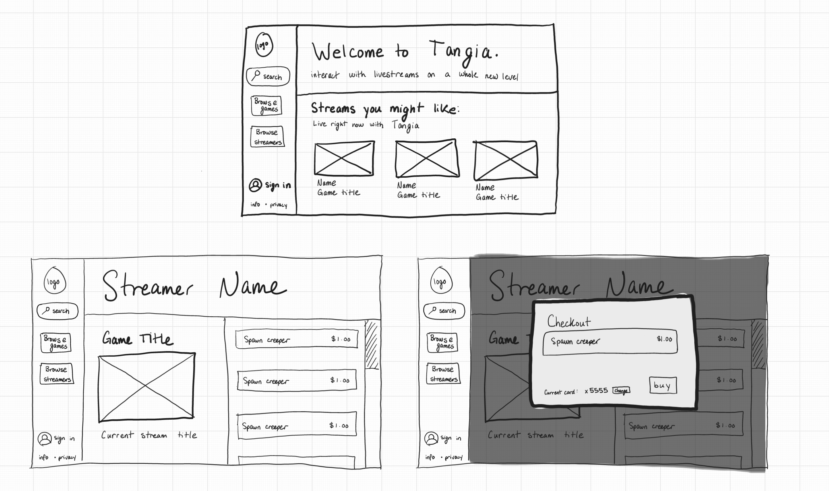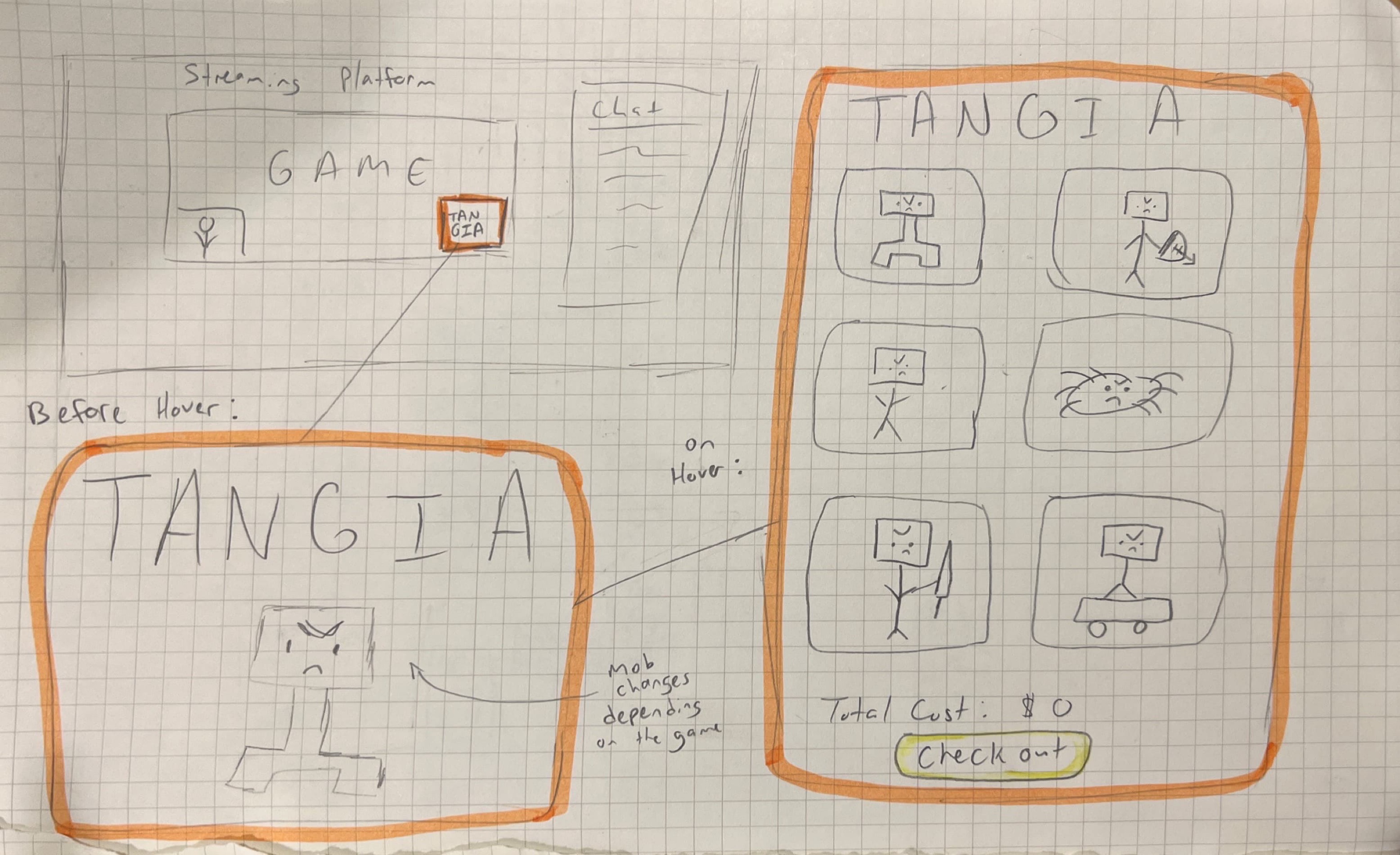 Tangia affects both the viewers and the streamers. Because we would expect the viewers and the streamers to see two very different interfaces, we decided to focus solely upon the interface for viewers. We sketched a variety of possible interfaces, all of which were intended for desktop.